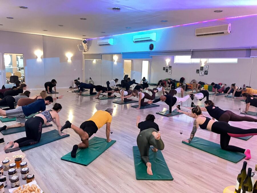 O evento Pilates & Wine reuniu exercícios desafiadores — abdominais, agachamentos, pranchas e alongamentos — sempre com muito equilíbrio (e, sim, muitas vezes com uma taça na mão! 😄).